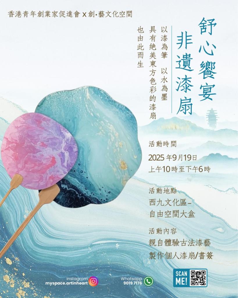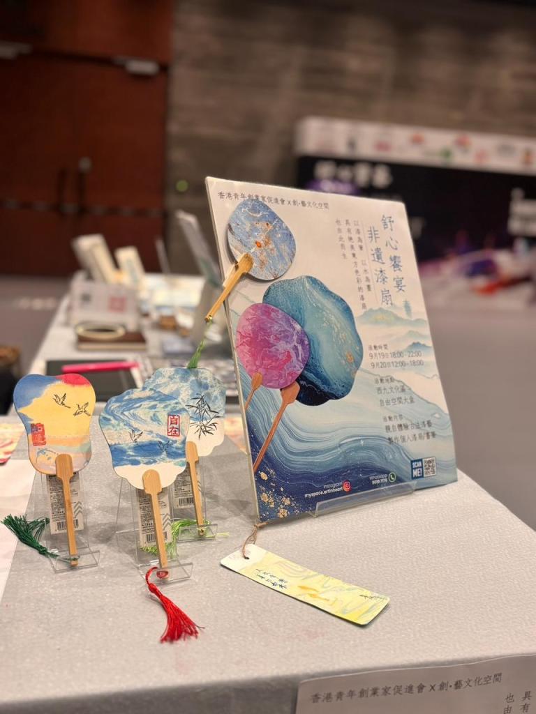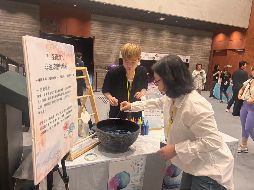 於2025年9月,百餘位香港青年齊聚一堂,以指尖感受千年漆藝,在流光溢彩中探索文化創業新路徑。香港青年創業家促進會主辦「舒心饋宴‧非遺漆扇」文化體驗活動,透過製作傳統漆扇,讓本地青年親身體驗非物質文化遺產的獨特魅力,同時探索將傳統工藝融入現代創業的可能性。活動現場洋溢著創意與文化的交融氛圍。在專業工藝師指導下,參與者學習了漆扇的歷史背景、製作工藝及技巧,並親手創作屬於自己的漆扇作品。